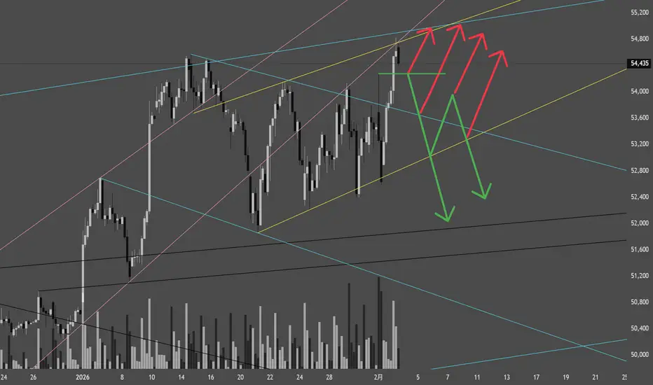 小さな水色チャネルは上抜けるも、新高値で一旦の反落か。