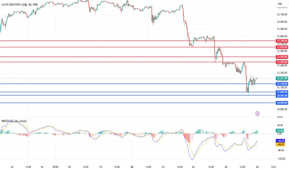 나스닥은 매도세를 이어가며 하락마감하였습니다. 일봉상 120일선까지 하락하면서 큰 박스권의 하단까지 순식간에 내려온 모습입니다. 일봉의 MACD가 Signal선을 데드크로스 하면서 급락하는 모습으로, 전저점을 중심으로 한 지지반등 구간이 가능한 영역까지 내려왔습니다. 특히 어제 5일선에서 매도 대응 가능한 날이었는데, 매수 반등조차 없었기 때문에 5일선과의 이격이 큰 만큼 언제든 분봉상 움직임에 따른 지지반등 가능성이 있으니 참고하시기 바랍니다. 일봉상 매도세가 거세게 나타나고 있는 만큼 현재 구간에서 며칠 횡보하더라도 추가적인 하락 가능성이 높으니 매수 대응은 손절 꼭 잡고 대응하시는 게 좋겠습니다. 240분봉상으로는 매도세가 계속 이어지는 모습으로 MACD와 Signal선이 0선 아래로 상당히 급락하는 모습입니다. 과거 20763 부근의 저점과 비교해보더라도 MACD의 하락폭이 더 크기 때문에 지지반등하더라도 MACD가 다시 0선 위로 올라와서 매수로 방향잡기에는 각도가 너무 가파른 상황입니다. 전반적으로 반등 시 매도 관점으로 대응하는 게 유리하겠으며, 분봉상 저점을 다지고 반등하면서 5일선까지도 상승 가능성을 열어둬야 하니 참고하시면 좋겠습니다.
