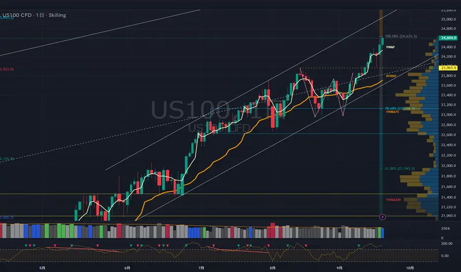 VWAPを下抜けて下落する場合は、9月17日(水)安値23,992がサポートテストラインとなる。8月14日高値(黄色水平線・点線)も同様の水準でテクニカル的には意識されやすい場所かもしれない。