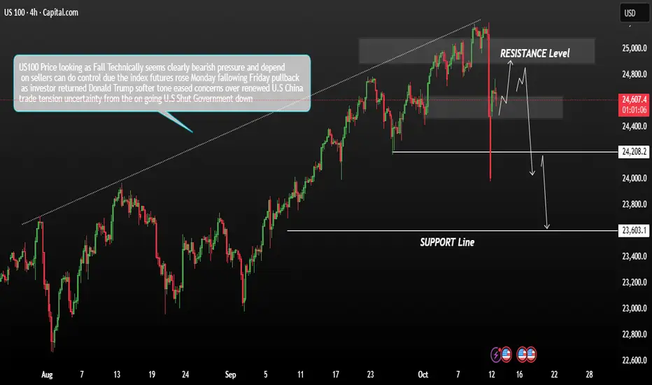 The US100 index is currently showing signs of persistent bearish pressure. Following Friday’s pullback, futures rose slightly on Monday as investors reacted to a softer tone from Donald Trump, which eased some concerns over renewed U.S.–China trade tensions. However, broader market uncertainty remains elevated due to the ongoing U.S. government shutdown and cautious sentiment in equities.