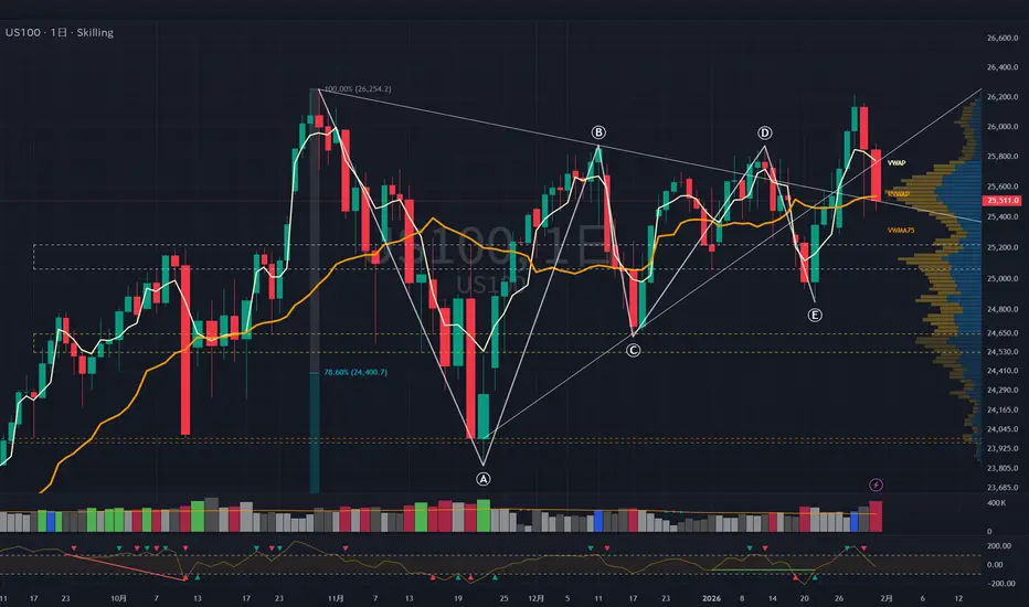 サポートされて反発するなら、D地点より上まで回復できるのが理想的な水準。ただ上は売り圧力が高まりやすいので重石もかかる。GOOGLやAI関連株の決算発表があるので、このあたりの期待値調整がどう反映されるか注目。