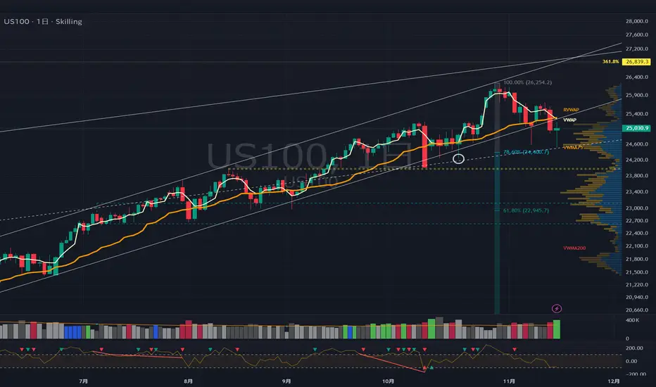 結果は11月7日(金)の安値こそ下回ったが、10月17日安値24,238.7まで下がることはなく下落幅は小さく収められた。ナスダック100も11月14日(金)の下落は75日出来高加重移動平均線でサポートされた動きをしている。75日出来高加重移動平均線の手前で下落ストップした後は、上昇に転じてリバウンドしている。わずかに陽線となったが、高値はローリングVWAPとVWAPの手前で止まって失速しているのも特徴的だ。要は平均に戻すと売られる弱含みで、下値はサポートされる状況。上・下どちらに抜けていくか材料待ちのようだ。
