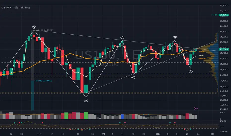 今週はグリーンランド問題で高値・安値を切り下げて下落したが、その後、元の水準まで回復する展開となった。先週末時点の下落シナリオには「12月11日付近の高値圏で売りが続く展開や週末の続きで下落進行となった場合、再びローリングVWAP(RVWAP)を下抜けるときは、75日出来高加重移動平均線のサポートテストとなる。75日出来高加重移動平均線とかぶっている一番上の黄色の点線ゾーンでサポートするなら、反発で上昇継続となるか。一番上の黄色の点線ゾーンを下抜けてしまうと、24,900~24,950あたりまで下がる可能性がある」と書いていた。
