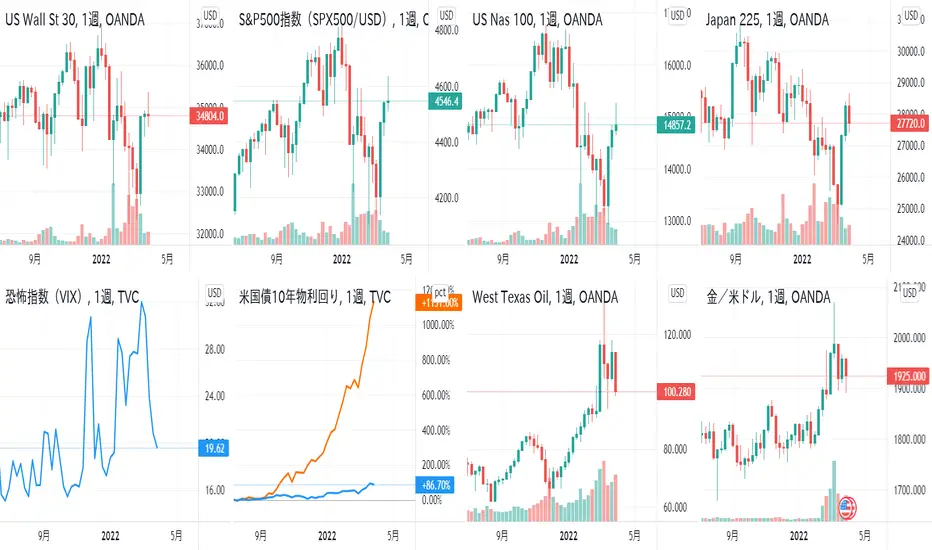 現在、NYダウ(US30)、S&P500(SPX500)、ナスダック(NAS100)、日経225(JP225)、恐怖指数(VIX)、米国債10年利回り(US10Y)・2年※オレンジ色(US02Y)、WTI原油(WTICOUSD)、ゴールド(XAUUSD)の8つのチャートを同時に表示させています。