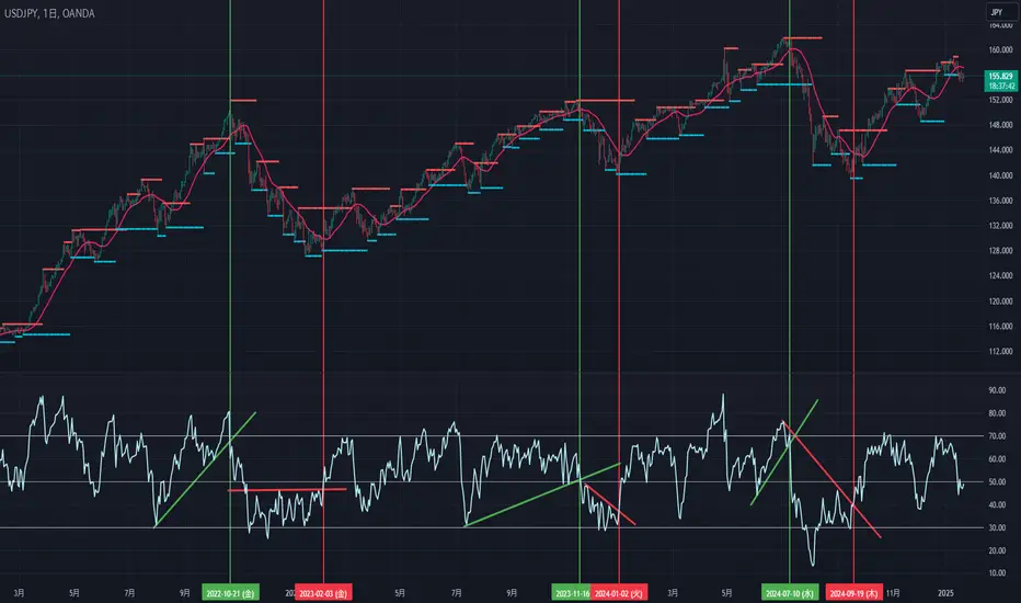 RSIに切上げ線、切下げ線、水平線を引いて、そのブレイクと、MA20とローソク足のクロスで、転換をとらえる試みです。