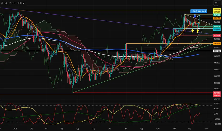 現在の強いサポートラインとなっているのは154.5~.4付近の辺りですが、ここが押し目となって上昇しているので、これから解説する下位足までのテクニカル的な基準の安値を154.4台として見ていきたいと思いますので覚えておいてください。