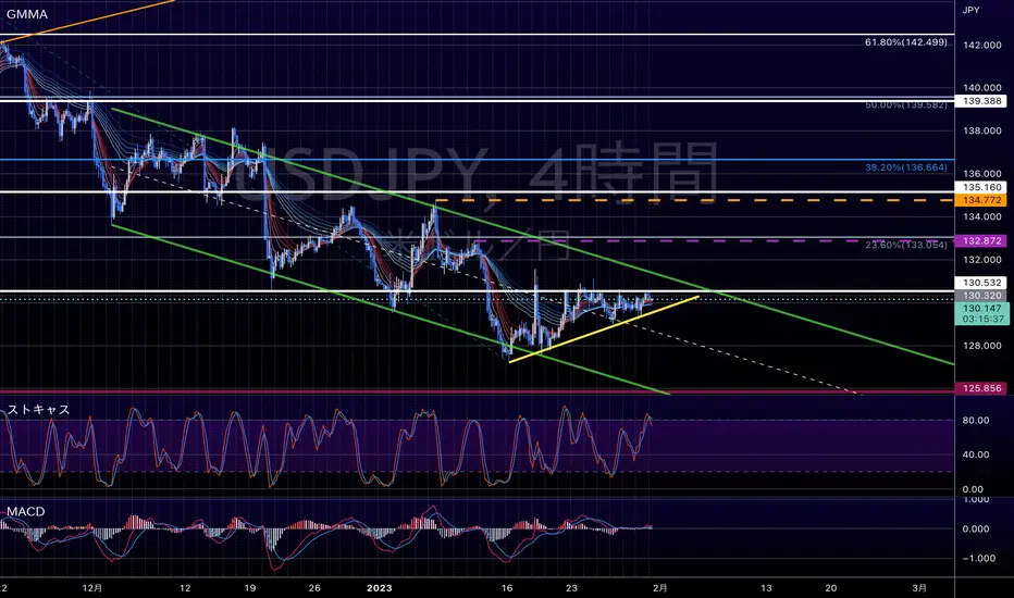 ただし、上抜けた場合はすぐに緑の平行チャネル上限がありますので、上抜け後の急落には注意ですね。