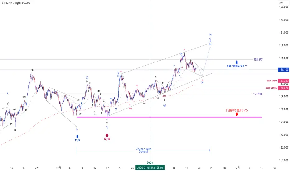 ●引き続きドル円は12/5以降(または12/16)から進行中のダイアゴナルが継続中の動きと見て、ロング目線継続を優先的に考えています。