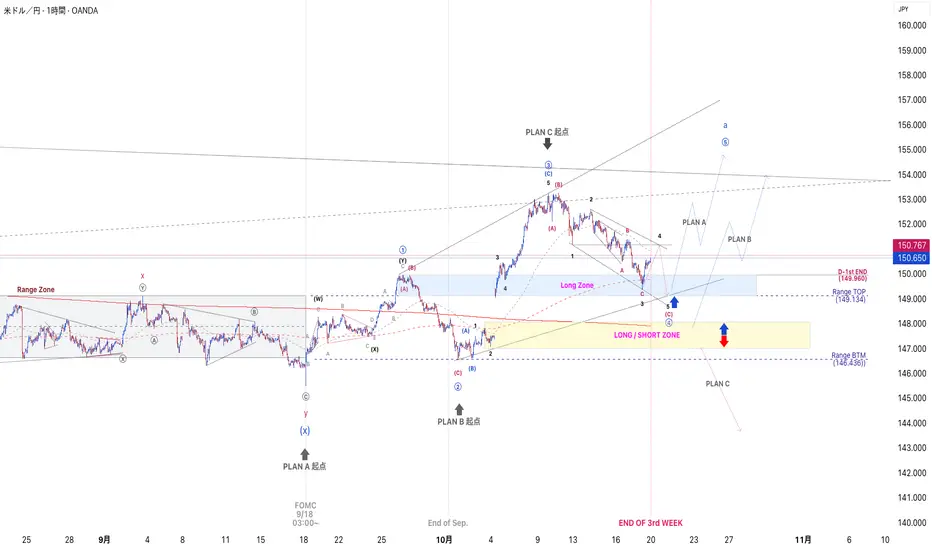 このケースでは押し目が黄色のエントリーゾーンまでの下落、高市新総裁決定でのギャップアップ窓を閉めてからの上昇。PLAN Aとは別の波形となり、4/22~からの上昇が(a)(b)(c)ジグザグ波形。その(c)波ダイアゴナルのii波下落からのiii波上昇の流れ。