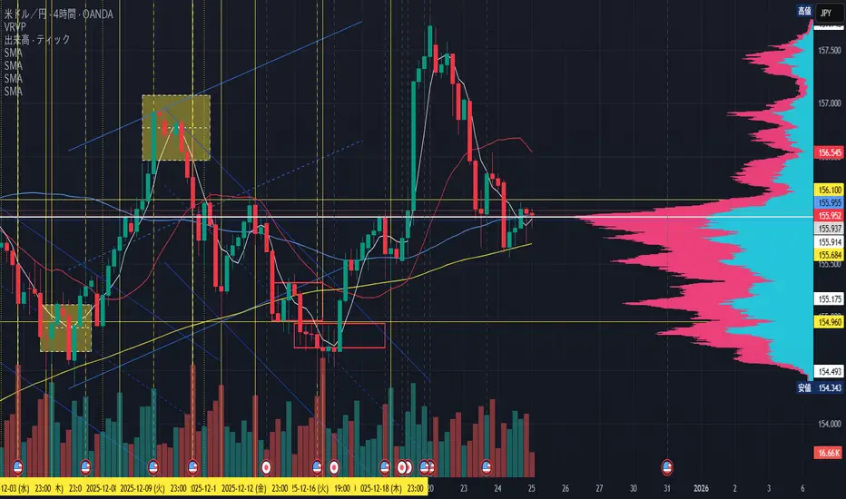 現状のUSDJPYは目先155.95にある出来高の山が75SMA(青)に重なり、価格膠着。