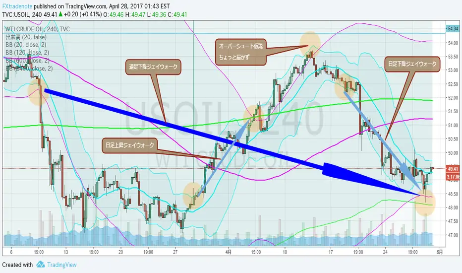 4月27日、日足-2σ到達して、日足下降ジェイウォーク完成。