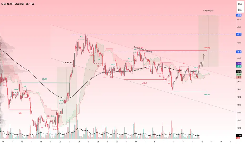 USOIL has been confined within a persistent downtrend channel on the 1-hour chart since mid-October, exhibiting lower highs and lower lows amid supply overhang concerns and subdued demand signals. The recent decisive breakout above the upper channel boundary near 60.80 has invalidated this bearish framework, confirming a structural shift as buyers absorb resistance and propel price into expansion territory.