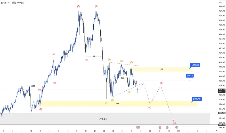 現在の構造: 強い上昇インパルス(推進波)の後、ゴールドは主要な調整局面にあります。直近の価格構造はブレイクされ、短期トレンドが**弱気(下落)**に転じたことを確認しました。