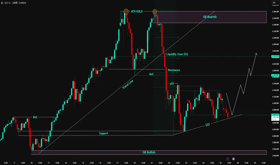 歴史的高値 ATH GOLD 4,371 USD に達した後、金は深い調整を経験し、短期的な上昇構造 (BoS) を破り、再び OB Bearish 上部 をテストしました。