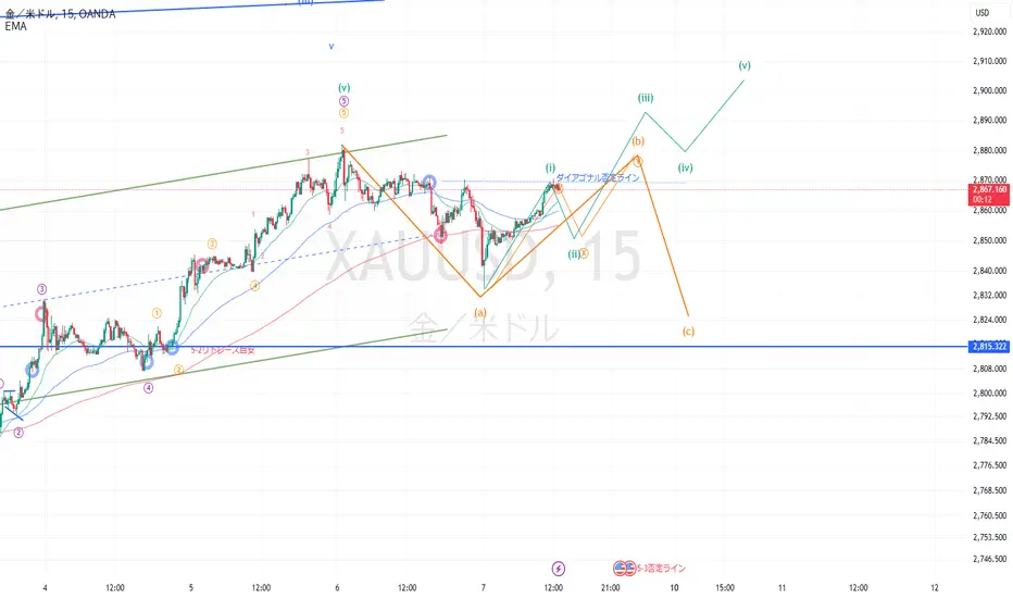 ①緑ライン 昨日の下落がジグザグで終了し上昇のダイアゴナル1波が始まったと想定
