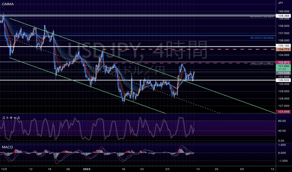FX ドル円 本日の相場分析 2023.2.74時間足では緑の平行チャネルを上抜けてきました。