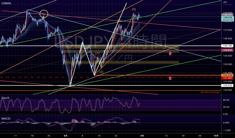 前回高値を更新していく1,2のシナリオの可能性が高いが、4波の戻りが浅いため、高値を更新しても140円を突破して強く上昇していくかどうかは今現在では判断が難しいので、節目のラインまでで一旦利確することが大事そう