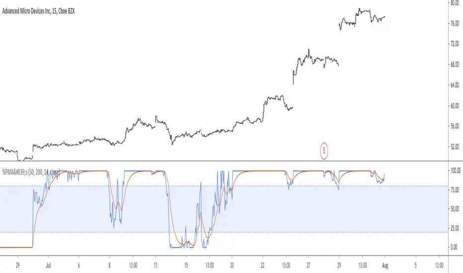 Return the percentage of closing prices greater than SMA's with periods within a user-selected range. An exponential moving average applied to these results is also displayed (in orange).