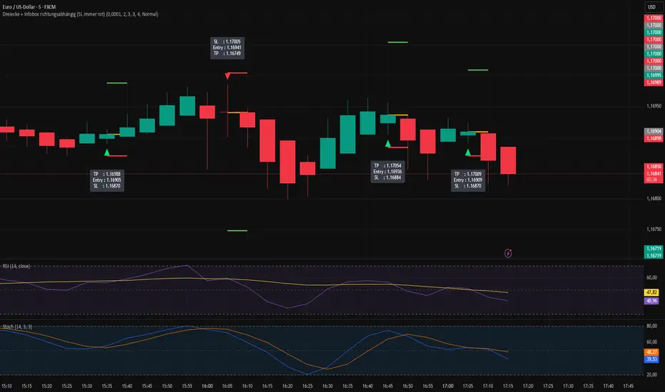 Triangles (trade direction) + info box (SL/Entry/TP)
