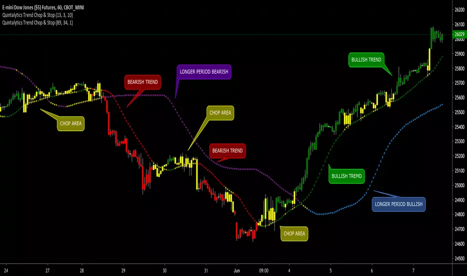 Quintalytics Trend Chop & Stop is a combination of a Trend, Sideways/Chop Detection, and Trailing Stop Loss indicator. This indicator is suitable for use in all timeframes and markets.