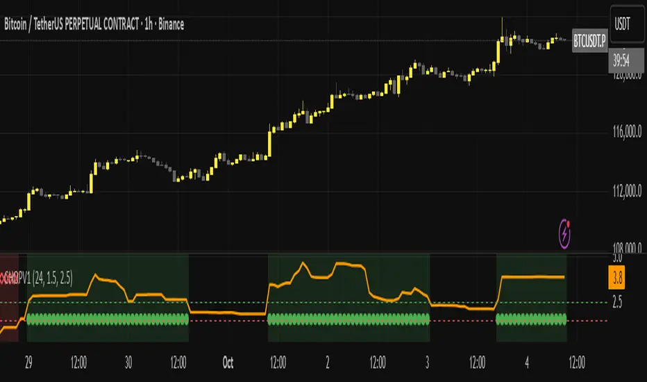 Exhaustion → Balance: After a long green phase, Range% falls back toward the middle → take profits into HVNs, expect more two-way trade.