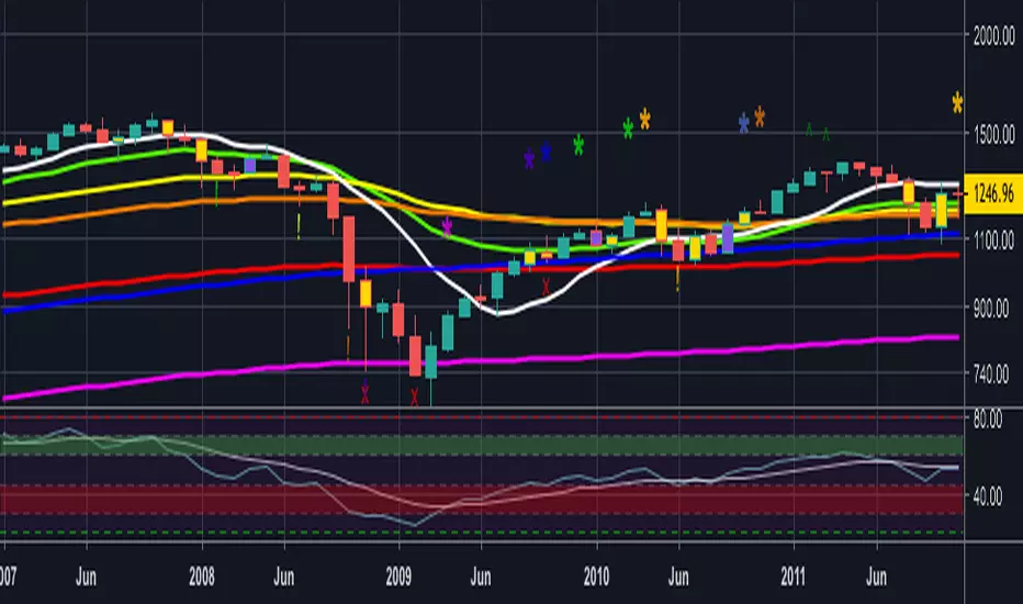 Marked by "!" below candle, colour co-ordinated to match moving average