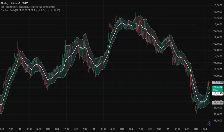 The Snapfront Coherence Bands (SCB) extend classic ATR-style bands with a coherence-driven engine. Instead of simple volatility envelopes, SCB adapt dynamically to market entropy, trend stability, and regime detection.