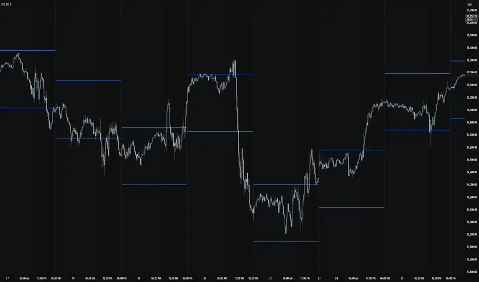 This indicator displays dynamic upper and lower bands designed specifically for NQ (Nasdaq-100 E-mini) futures contracts, including their micro variants (MNQ).
