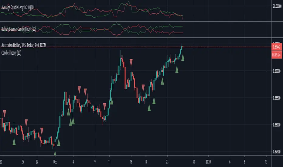 Description: The theory behind this script is that if within the last 10 candles, if the majority of them are green and the average length (wick to wick) of those majority green candles is greater than the average length of the minority red candles then it will signal that this is a bullish move within the market and signal you to buy. The opposite is true for bearish moves.