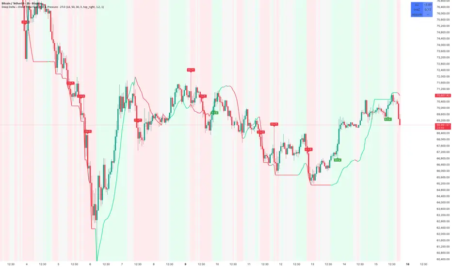 Deep Delta is an order-flow pressure framework that models intrabar buy/sell dominance using price-distribution-weighted volume, then statistically normalizes that pressure to identify actionable imbalance events.