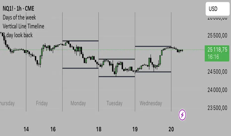 It plots each day’s High and Low, aligned from Midnight to Midnight, with a clean session structure. This makes it easier to identify: