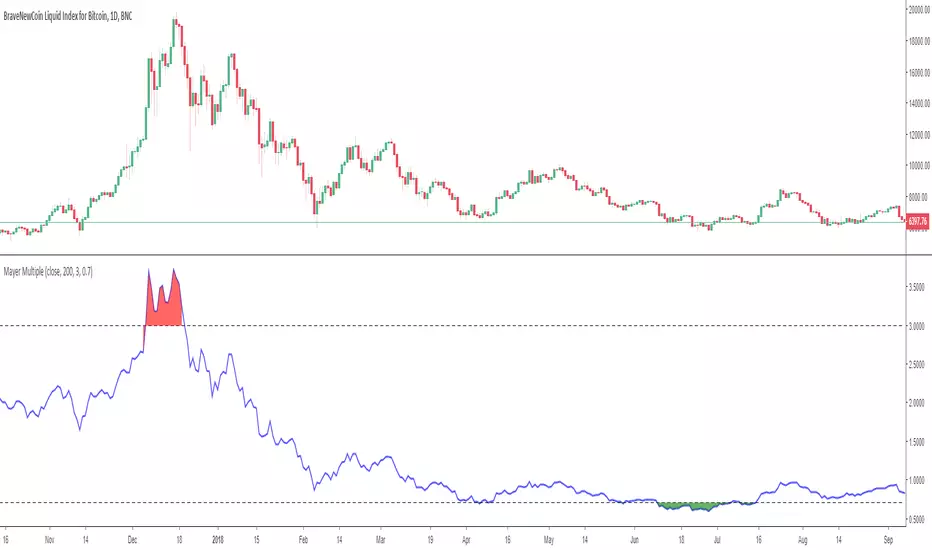 Introducing the Mayer Multiple script…the Mayer Multiple looks over extended periods of time and pinpoints when a cryptocurrency was overbought/sold. The calculation itself is simply the price of the cryptocurrency divided by the 200-day SMA. The default settings are based on Trace Mayer’s recommended numbers but can be adjusted to satisfy your own preferences.