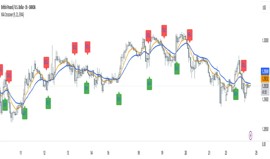 ✅ Clear Buy/Sell Signals – Displays "BUY" (green label) when the Fast MA crosses above the Slow MA and "SELL" (red label) when it crosses below