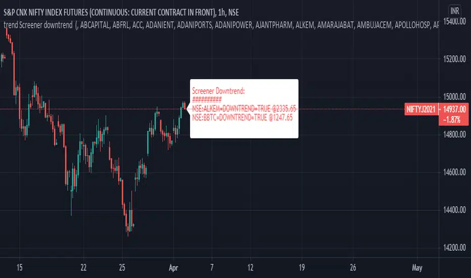 - previous trend screener i have published, In this code only downtrend screener is there ,This is type of custom screener I searched and made to screen bulk stocks any one can modify it, other may get help out of it.