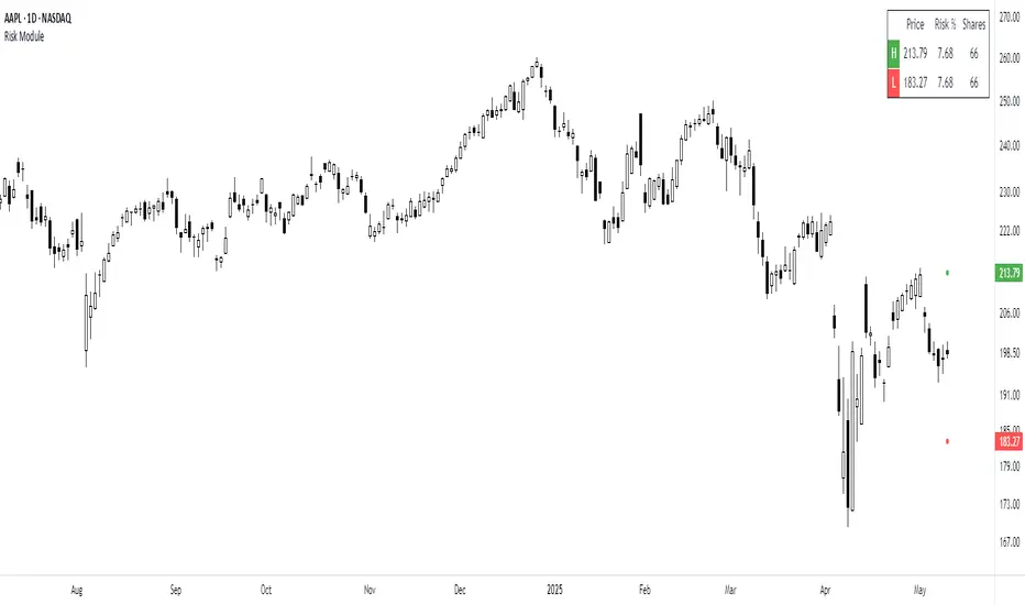 This indicator provides a visual reference to determine position sizing and approximate stop placement. It is designed to support trade planning by calculating equalized risk per trade based on a stop distance derived from volatility. The tool offers supportive reference points that allow for quick evaluation of risk and position size consistency across varying markets.