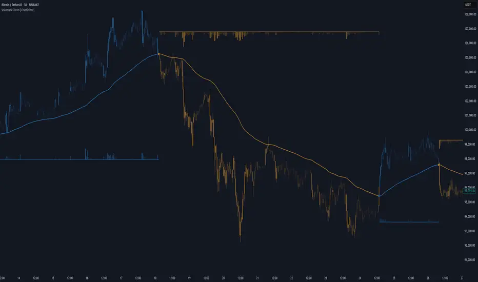 Volumatic Trend [ChartPrime] gives you more than just trend direction—it provides insight into the force behind it. With volume-graded candles and real-time histogram overlays, traders can instantly assess whether a trend is backed by conviction or fading strength. A perfect tool for swing traders and intraday strategists looking to add volume context to their directional setups.