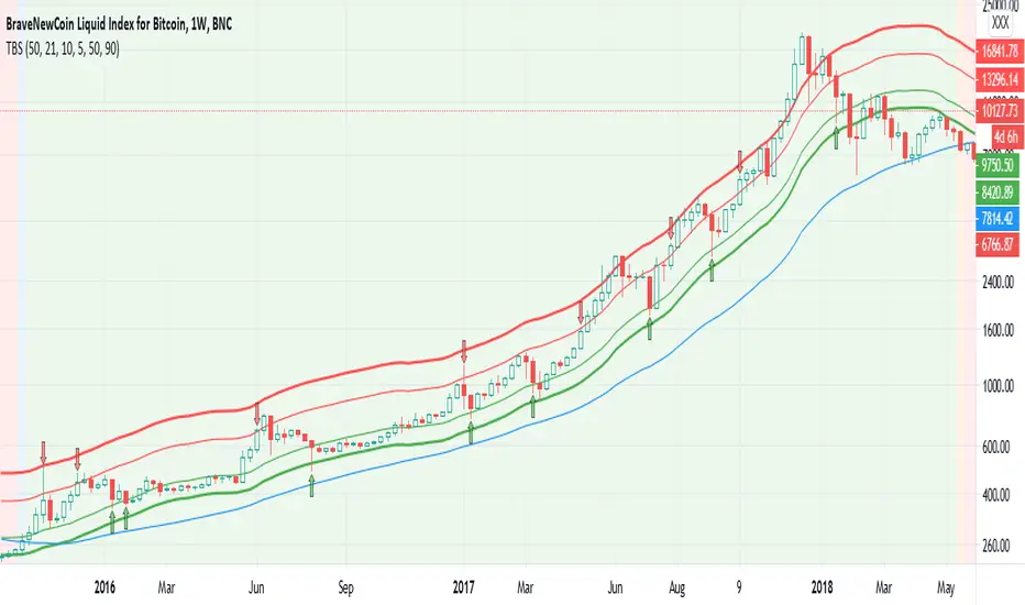 Example: Default settings for BTC Weekly charts are Trend Moving Average = 50, Support Moving Average = 21, Motivation Buy = 10, Tolerance Buy = 5, Motivation Sell = 50 and Tolerance Sell = 90. That means in uptrend identified by green background every time the closing price touches 10% higher than 21 week moving average value TBS suggests buy, so a trader can choose to buy 80% of intended position at this level. If the price continues to drop down and touches 5% below 21 week moving average, a trader may choose to buy another 20% at this level. In the likely scenarios of price hike from here a trader may choose to sell 80% at the Motivation Sell level 50% higher than 21 week moving average. If the price reaches Tolerance Sell level at 90% higher than 21 week moving average a trader may choose to sell remaining 20% of the position.