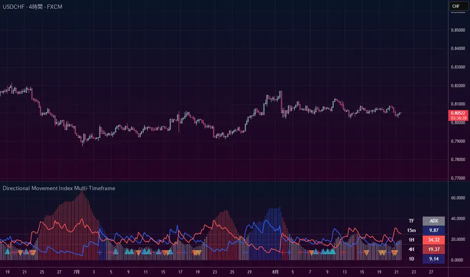 このPine Scriptインジケータは、複数の時間軸にわたってトレンドの強さと方向を同時に分析するための包括的なDMI(方向性移動指数)マルチタイムフレームツールです。