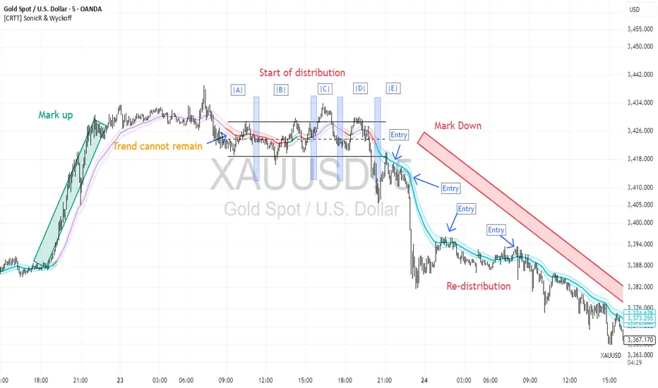 A trend detection based on Wyckoff method to identify phases as trend of the market and using SonicR system to find entries.Based on Wyckoff theory, we have around 5 phases: A, B, C, D, E...and the colors of SonicR Dragon bands (EMA34) are used to detect the phases. Red and Blue are 2 colors for downtrend / Green and Purple are uptrend.