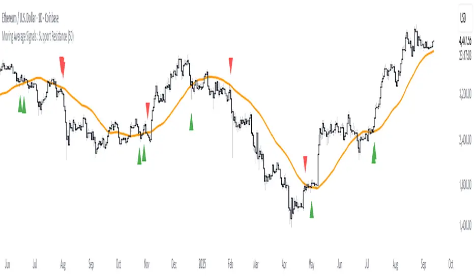 This indicator plots a Simple Moving Average (default 50-period, adjustable) and highlights potential bounce or rejection signals when price interacts with the SMA.