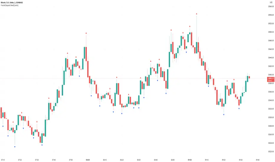 In contrast to the default Williams Fractal generator, this one also shows fractals if the two candles before or after are equal (>=, <=).