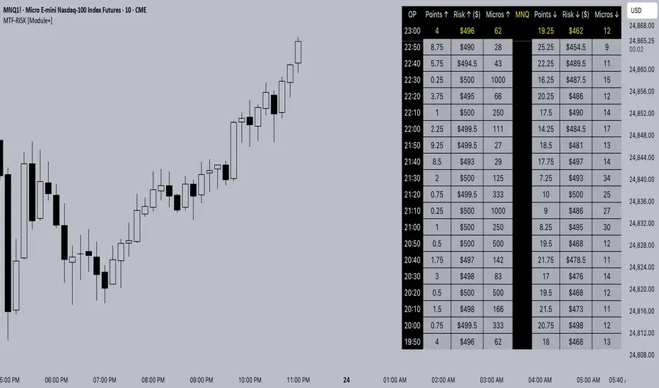 MTF-RISK [Module+] is a futures risk management tool that calculates standardized position sizing across multiple CME micro contracts, anchored to higher-timeframe structure. By combining multi-timeframe reference levels with a contract-based dollar-per-point model, it allows traders to maintain consistent risk across different futures markets.