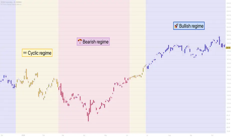 The Market Regime Detector (Pro) is an elite, consensus-based market state analyzer designed to filter noise and identify the true underlying market structure. By distinguishing between trending (bullish or bearish) and cyclic (range-bound) market conditions with high precision, this detector acts as the "brain" of your trading system. Instead of forcing a single strategy across incompatible market conditions, the detector empowers you to deploy the right tactic at exactly the right time.