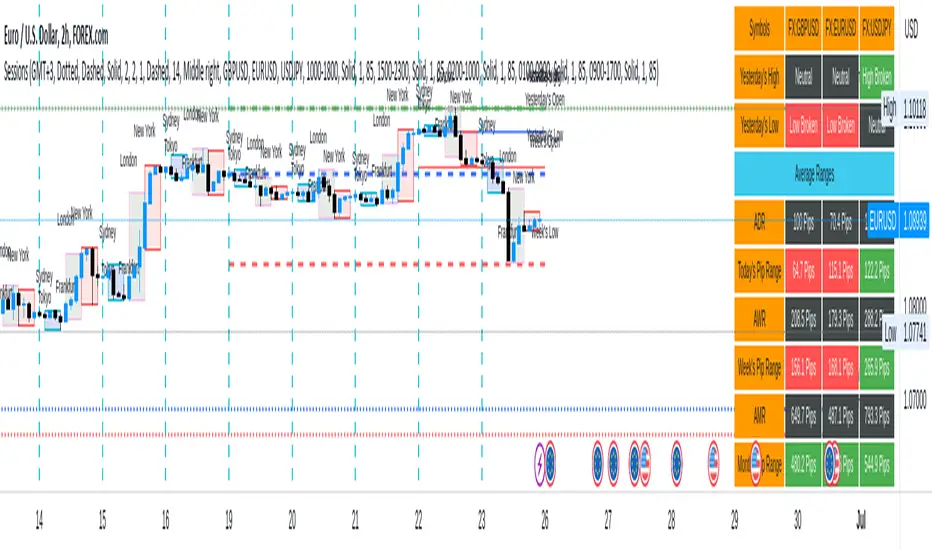 The script below is designed to show up to 4 different trading sessions i.e. London, New York, Tokyo and Sydney sessions, it also displays the days each session is taking place in as well as two horizontal lines one for the previous days high and the other for the previous days low.