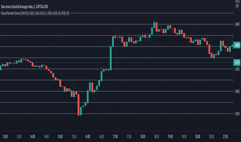This indicator shows zones of round numbers for 3 custom symbols like US30, EURUSD or GOLD as lines in the chart. The starting price can also be the current or a custom one and you can configure the increments as well.