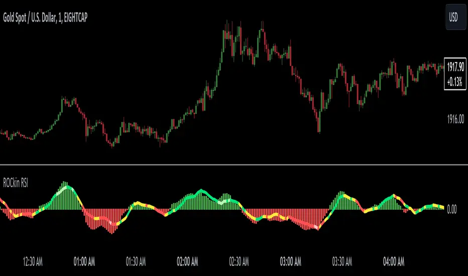 OverviewThe "ROCkin RSI" indicator combines the traditional Relative Strength Index (RSI) with an innovative approach using the Rate of Change (ROC) to offer a new way to visualize and interpret market momentum. By averaging the slope of the RSI over time and allowing for different types of moving averages, this indicator aims to help traders identify trending and reversal patterns more efficiently.
