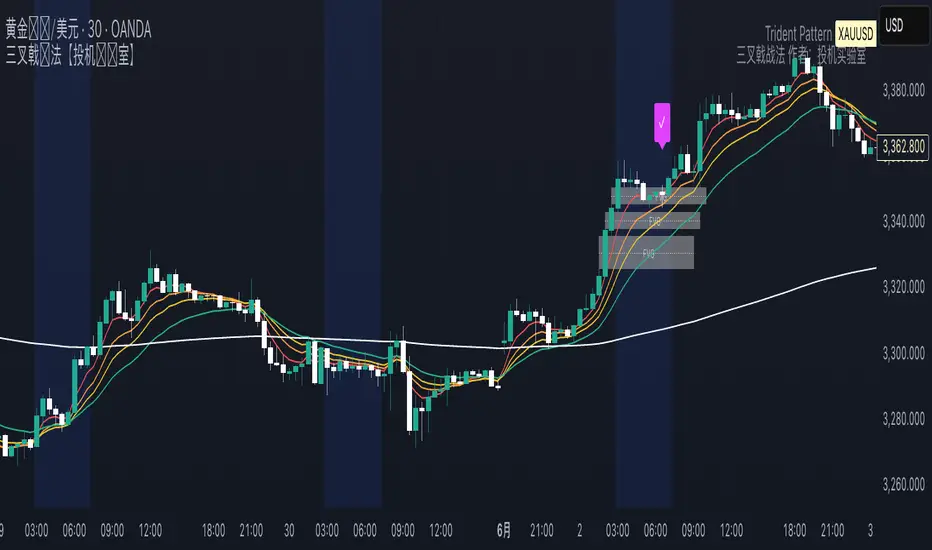 本指标基于近年来日益流行的 Trident(三叉戟)策略,推荐使用在 30分钟时间框架,尤其适用于黄金、比特币、纳斯达克等具有自然上涨倾向的交易品种。本指标由 Speculation Lab 原创开发,结构严谨,逻辑清晰。