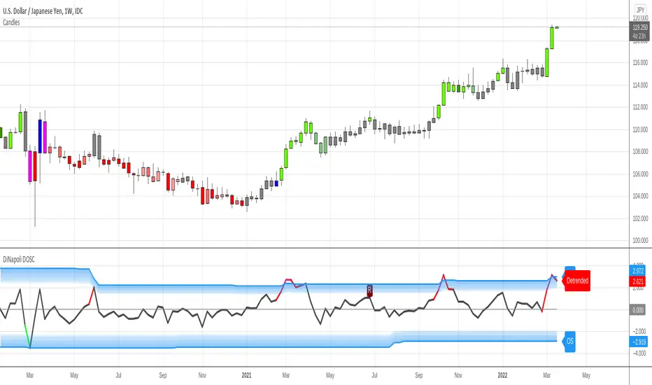 DiNapoli Detrended Oscillator (DOSC) is a custom indicator used for identifying OverBought (OB) and OverSold (OS) condition in markets.