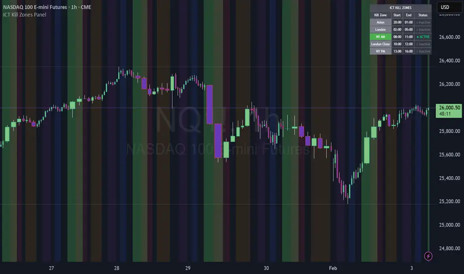 A simple, objective indicator to identify ICT Kill Zones with real-time status and smart visual highlighting based on New York timezone.