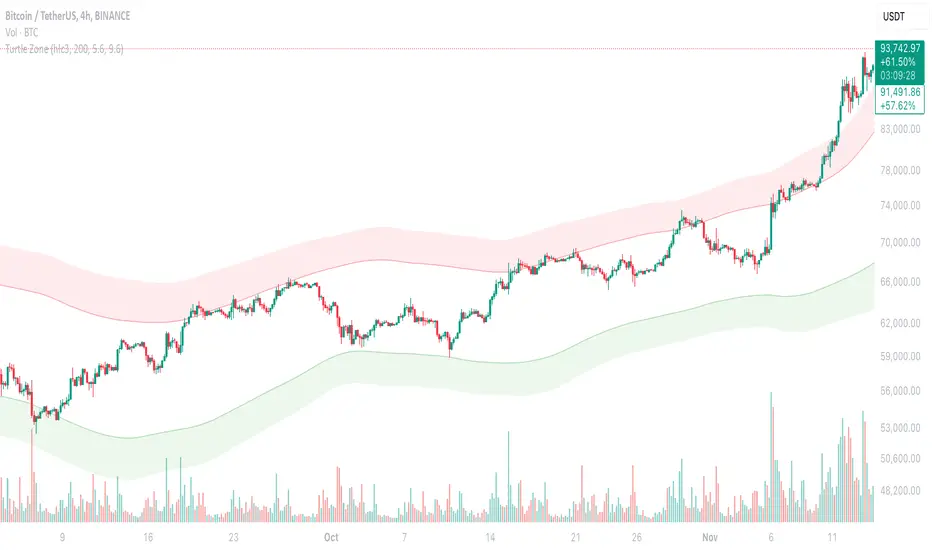 Turtle Zone indicator helps to visually determine support and resistance zones of the price movement.Displays a channel with zones located symmetrically around the moving average of the price.